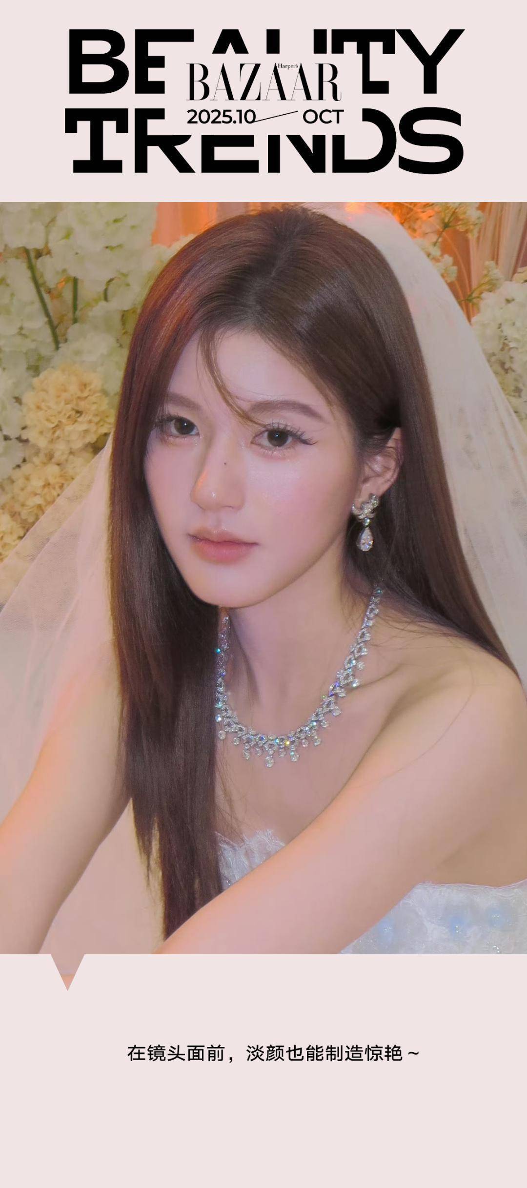 她通过降低整体对比度来柔化五官:浅雾眉与轻盈的假睫毛不仅柔化面部轮廓,还带来温润的氛围,使表情更加自然且富有感染力。